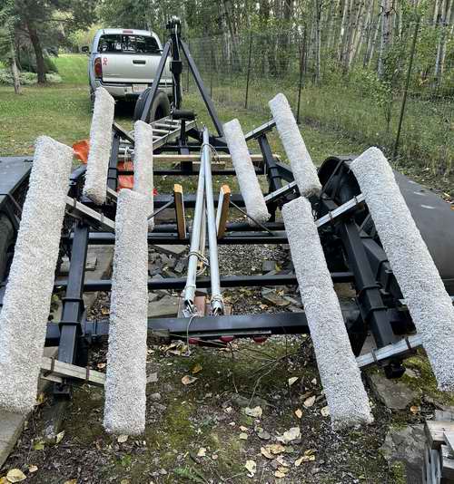 off the hull. Also, the keel settles on the support as it floats on the trailer and lifts off the support as it floats off the trailer. So you shouldn't have to adjust the support for launch or retrieval. TOP BUNK BOARDS, FIXED or ARTICULATING - Wood bunk boards should be covered with rug to protect the gel coat on the hull. The more surface area against the hull the better the support. After all, they hold the entire weight of the boat while stored on the trailer. Panache is supported by eight 42" long 2x4s with a total area of 1008 in2. This equates to 2.98 lbs/in2 loading on the bunks. Most of the keel weight is supported by the keel support bar and the bow is supported by the front roller. With the keel support holding ~950 lbs the bunk loading goes down to 1.8 lbs/in2. If a trailer has two long fixed bunk boards they are shaped to match the curvature of the hull. I have seen bunk boards with 2 and 3 support posts. 3 seems best because it is possible to force the curve to match the hull, ensuring uniform support along the bunk. If the trailer has four articulating bunks they must fully align to the hull. However, a limit to the articulation is desirable when retrieving the boat on the ramp. You don't want a surprise of a rolled over bunk supporting the hull as it comes up the ramp. That is really annoying. The height of each support post must be adjustable to distribute the weight equally amongst them. Each post is made of telescopic tubing and must must have a large drain hole at the bottom to drain water so the post can't split with freezing. This is still important if you use a crane or travel lift to launch your boat, as there is always rain water, wash water or dew to contend with. All the water must run off quickly so the metal drains drip dry. Dry metal can't rust and salt encrusted or dirt coated metal has an affinity for water, causing it to corrode all too quickly. COVERING & WOOD ROT (2025) - Most bunk boards are made of wood
