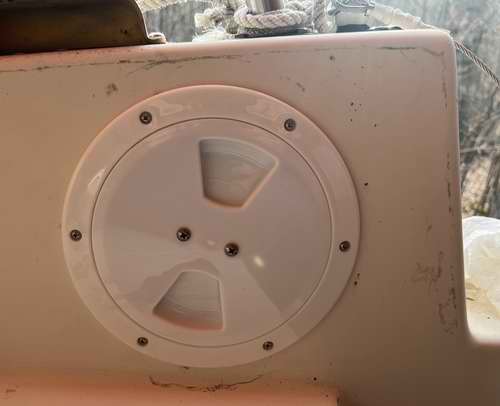 UPDATE Panache Inspection Hatch (2025) - Late this Fall I too installed a 6" ID vinyl inspection hatch on Panache to check all the hardware inside the transom: nuts for outboard bracket & backstay chain plate, cockpit speaker, outboard wires and the gas hose. It's just too much effort to reach this stuff doing the "cockpit crawl" over the cockpit drain hoses. I was given a 5" ID hatch but it's not quite large enough to slip my arm through. This job requires a 6" ID hatch to reach things. The rest of the hardware (rudder gudgeons & port chain plate) are fairly easy to reach from the cockpit locker. That locker needs to be cleaned out every once in a while anyway!