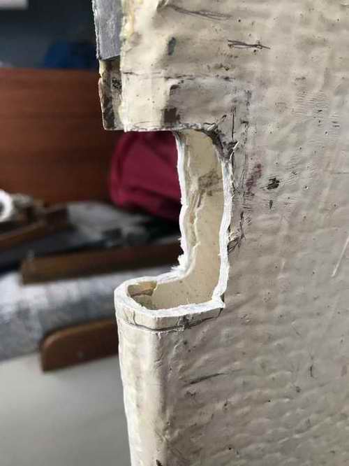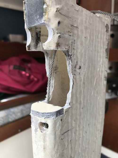 a hacksaw blade, Sawzall (slow speed, small carbide teeth, rounded tip), or serrated knife along the length of the centerboard trunk