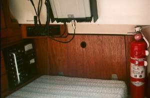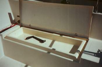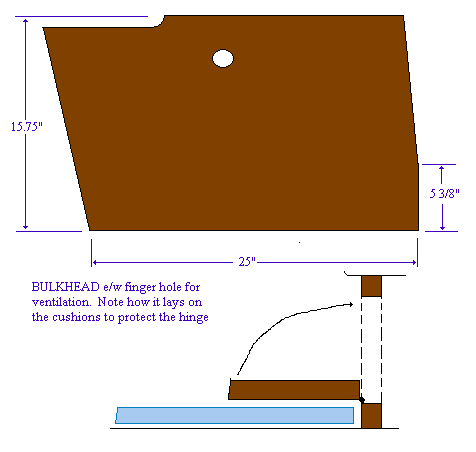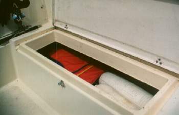 VERSION 1 PANACHE (2000) - My reason for cutting the bottom out of the starboard locker was to create a storage locker for wet lifejackets and fenders. I closed off the forward end of the locker with a teak plywood bulkhead equipped with a door to access the life jackets from the cabin. Ready access can't hurt. I also closed the 4" wide opening parallel to the cockpit foot well using 1/4" plywood. This prevents the jackets and fenders from sliding under the cockpit. The plywood divider is perforated with vent holes and coated with Sikkens Cetol. Below are the before and after images of Panache's locker. CONSTRUCTION - To remove the bottom of the shallow locker;
