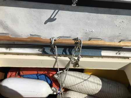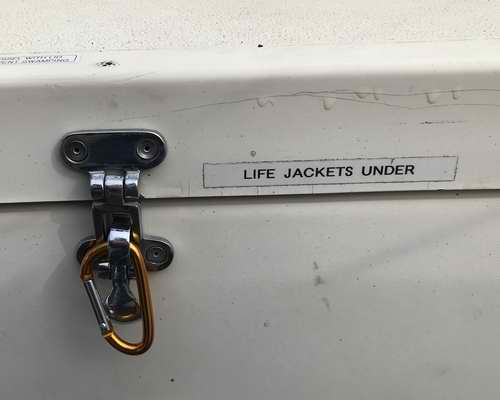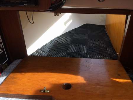 2018 Drop Board Storage - Note the plywood on the right, inside the locker. It is holding the companionway drop boards in the closed position, up tight against the inside of the locker. See Tech Tip B19. LOCKER GRATE PANACHE (2019) - I don't often go to the bottom of this cockpit locker and while it