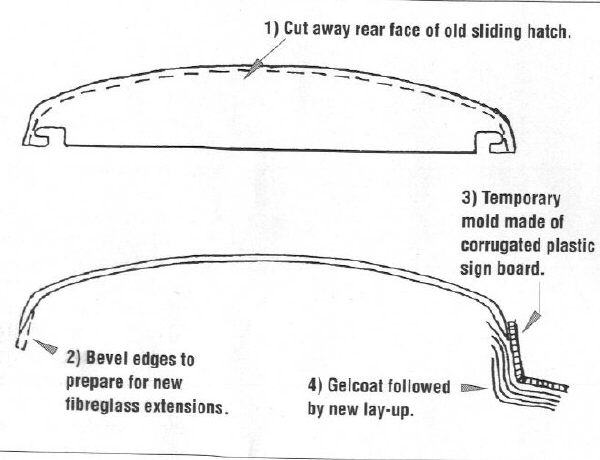 ![]() There are two methods of converting the old hatch to a storm hood. Regardless of the method, you must seal the front and sides to the deck to keep out water and growth. The first method is to determine where you want the hood fastened to the deck, then extend the sides and front of the old hatch with new fibreglass. Do this over a temporary mould. Follow the steps in the image at right. The new side flanges must fit snug to the deck as shown on the SJ28 above.