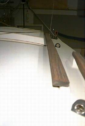 WATER DEFLECTOR - This deflector is an alternative to a storm hood to keep water out of the cabin by lowering the forward lip of the hatch so it skims just above the deck to deflect the majority of the water. Think of it as a cow catcher on the front of a locomotive that deflects an animal off the track. The addition of a hollow rubber gasket glued to the front of the sill stops the bit of the water that manages to slip under the deflector; provided the hatch is pulled back tight against the gasket. The deflector and the gasket go a long way towards sealing the front of the hatch to make the cabin more water tight and mosquito free.