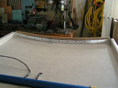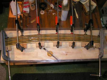 on the deck. When making a curved laminated beam from different colours of wood, the contrasting edges reveal any left/right symmetry errors, so accuracy is paramount. If you have to shape the beam differently on one end than the other (wrong curvature), such as sanding through to the second layer, you will be left with a none symmetrical pattern that will stick out like a sore thumb! A perfect fit starts with a symmetrical template that can be confirmed by folding it over on itself. The thinner the laminations the more accurate you have to be. Remember, is you screw up at least make it look intentional. You have to be creative here. Sometimes a job is more art than engineering! Shown above are the laminations clamped in the form while the epoxy cures.
