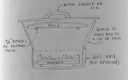 Lay the acrylic panel on a felt covered plywood mould just beneath the lid where it is warmest. Acrylic typically becomes soft at around 1700C and will droop quite freely over a felt covered form. It should bend in about 15 minutes with the BBQ on high. After it has formed to the mold shut the heat off to let it cool slowly with the lid closed. (SAFETY NOTE: Keep a fire extinguisher handy).