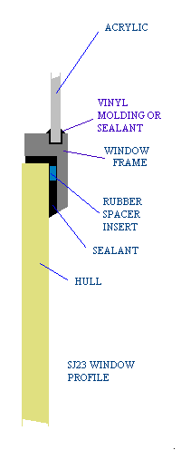 NOTE - To maintain a water tight seal the metal components used for the windows MUST NOT be installed rigidly against the hull. Rigid metal frame bends less than the hull that jiggles and flexes while under way. In addition, metal, and especially acrylic, have a larger thermal expansion than fibreglass. To maintain a water tight seal between the two requires a thick enough sealant that is flexible enough to allow for shear movement so the sealant is not torn loose.