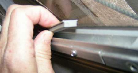 ____________________________________________________________________________________ REBUILD A WINDOW (Brian King): I replaced the vinyl glazing on both main windows in 2009. They have been in place for a couple of weeks now and experienced some pretty heavy Seattle winter rains. There have been no leaks so I'm pronouncing this a qualified success. Now it is only a matter of a test of time. It should be noted that I have tempered glass in my windows, not acrylic. See Glass below. The new vinyl moulding between the glass and the aluminum frame is for a 3/16" thick glass that fits in a 3/8" deep channel that is 11/32" wide. It is part number GC727C from C.R. Lawrence. While not an exact replacement the dimensions are very close and as such it fits snug. The actual measurements of the glass channel on my boat are 27/64" depth and 21/64" metal opening. Minimum order is a 100' roll and only about 20' are needed for the SJ23. Ordered on line, it cost about $72 with shipping to Seattle. Here are the photos showing the installation: