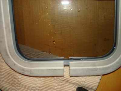 raining! The heavier the rain the better. If the acrylic is not scratched or milky, the minimum repair will likely involve resealing the aluminum frame to the hull. Trying to reseal the window by smearing sealant on the outside edges of the frame is not only incredibly messy and ugly, but almost certainly doomed to failure. Acrylic has a higher coefficient of thermal expansion than metal or fibreglass, which is why this window design leaks so often. This is especially true if the window frames are not sealed to the hull with the glazing version of polymer sealants designed to deal with large expansion and contraction. Some people rid themselves of this problem by replacing the acrylic with tempered glass. The clarity is far superior, they don't scratch, the window is easy to clean, and the ultimate strength is far superior to acrylic. The bonus is that tempering glass is fairly inexpensive. If there is a leak