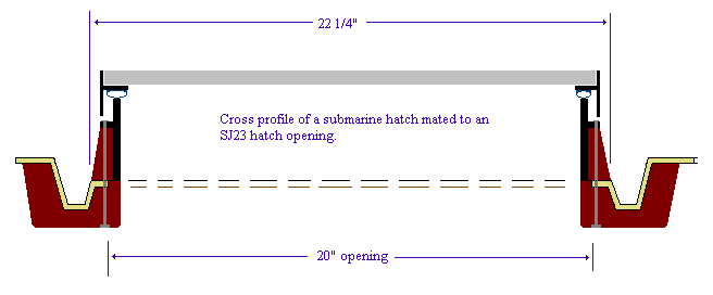 An alternative to a costly aluminum framed hatch might be to build a similar frame from wood. Fasten the corners with epoxy, float the acrylic inside the wood frame and seal it with Sikaflex. The hardware can be thru-bolted to the wood frame without concern for expansion or contraction stress on the acrylic. The biggest advantage is that it can be sized to exactly fit the existing SJ23 hatch opening. Levers can be attached to the wood frame. I know of several people who have built a hatch just like this and have no problem with it. Just food for thought! Below is a summary of the critical dimensions for selecting a commercial hatch.