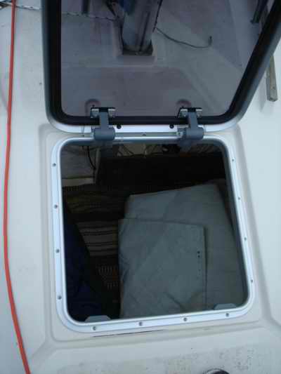 PROP UP HATCH - I use a short stick to prop up the hatch. A 6" stick at the mooring or anchor and a 2" stick while sailing in very calm weather. Although it is usually closed while sailing. The advantage of a stick is that if something should snag the lid, then the stick drops and the lid closes, undamaged. If I used one of those springs the lid might get damaged. If I loose a stick overboard, its no big deal. I just go to the bush and grab another one. NOTE: Because it may not be obvious to some