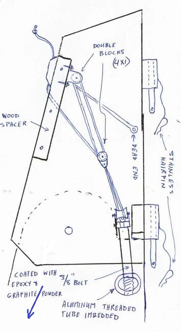 You now have a 3:1 purchase that is strong enough to pull the blade down while sailing. (To be a 4:1 purchase, the dead ended line should be attached to the bottom block). HINT: If you coat the hinge end of the blade (portion that fits inside the rudder head) with epoxy saturated with carbon graphite powder it will create an extremely hard and slippery surface, making it easier to pivot the blade. Mix the carbon graphite about 10% by volume. It makes a very black soupy mess! To complete the job, sand off any high spots and insert a bushing or stainless tube inside the pivot hole of the blade. Cut the tube ever so slightly longer than the thickness of the blade. This way you can tighten the pivot bolt and rudder head against the tube to eliminate side play without jamming the blade. Shortly thereafter I coated the entire blade with epoxy saturated with carbon graphite. NOTE: The short length of the static line between the bottom double block and the T bolt prevents the control line from sliding across the round top of the rudder blade. This minimizes internal friction and possible line jamming with the rudder head. This configuration has never jammed.