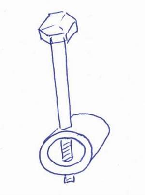 So I designed the internal 4 to1 block and tackle system shown below right. The free end of the line exists out the aft of the rudder head and is guided over the top where it lays over the tiller slot for ready use. The system works like a charm, both to hold the blade down and to release it quickly to allow it to float at the surface. Another reason why I developed this system was to lift the blade while motoring in tight quarters to prevent the propeller from hitting the blade when it is turned far enough to starboard. I have since installed a ring around the propeller to keep the rudder from touching it. See Tech Tip D06. The blade can be damaged from a myriad of other reasons so I'll let you use your imagination. See Tech Tip B09. CONSTRUCTION - Referring to the diagram below right, the first step is to imbed a 3/8" stainless steel bolt into the top of the blade to hold the turning block. The combination is effectively a T-bolt.