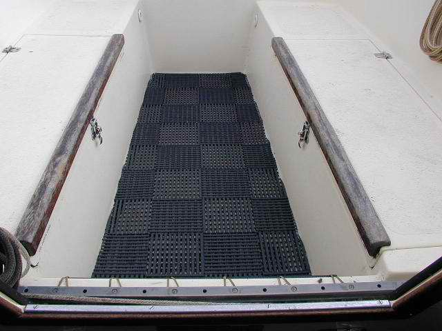 It will ensure that you draw an accurate outline of the cockpit floor along the centre line of the vinyl mat. It will also save you many trips up and down the ladder. Cut the template so it fits snug to the cockpit walls to ensure the mat does not slide when the boat is heeled. There is nothing more annoying than standing on a sliding mat. Use a very sharp stubby blade or a band saw to cut the vinyl material, creating a sloped edge that allows for the turn of the cockpit floor through the thickness of the mat. This way the top of the mat will lie snug against the wall creating a neat appearance. Once the template fits, draw a heavy line down the center of it for aligning the centerline to the vinyl mat. All corners are 1" radius. Use a hole saw to drill a 2" diameter hole through the grate, centered over each cockpit drain. Don't impede the flow. You may notice in the photo that the edges are stepped instead of smooth. This due to the shallow angle of the cockpit with respect to the straight lines in the mat. While I tried to straighten the edges by filling the voids with sealant, in the end I gave up as the matting worked perfectly fine. Not as neat looking as I would like but certainly simple and effective. After sailing several seasons with this mat in the cockpit, I am still very happy with the performance and my cabin floor stays cleaner. Now I just have to sweep away the sand under the mat or wash it to the cockpit drains! It's amazing how much gets trapped there. Cleaning the mat is accomplished with a quick dip in the lake. I have never seen anything stick to it. NOTES