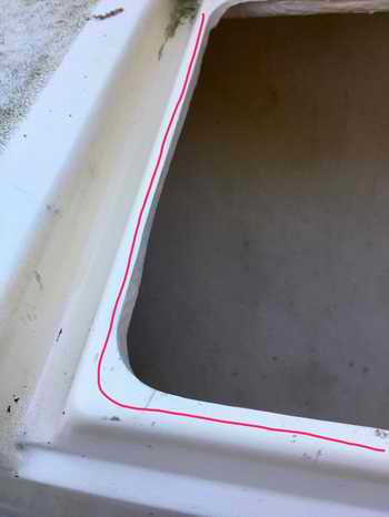 NOTE - While the automotive industry has used hollow EDPM gaskets for years, the marine industry seems to stick with solid neoprene foam that stays compressed for a long time after the load is released. It generally leaks after a season of use because it doesn't have the resiliency to spring back to the original size. This is due to the extremely small pores of the foam. While EPDM foam may also not spring back as quickly when compressed, the fact that the foam forms around the cockpit lip means that it developed a seal. The best place to install the foam seal is on the bottom of the locker lid, pointing down. The lid offers a flat surface area for best adhesion. The top of the locker lip is usually very irregular and too narrow in places as shown below due to the freehand cutting of the opening at the factory. Besides, if it is installed on the lip, it will get beat up with every trip into the locker.