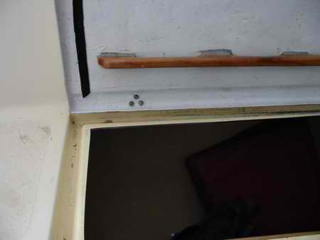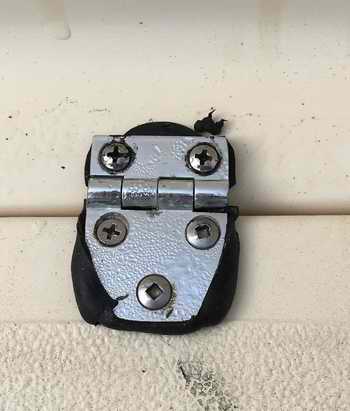 Below is one of Panache's hinges sealed with butyl rubber. It was left untrimmed for this demonstration. The excess was later trimmed with a razor knife. In hind sight, the majority of water that leaked into Panache's locker flowed through the unsealed hinges.