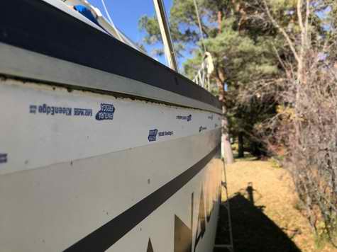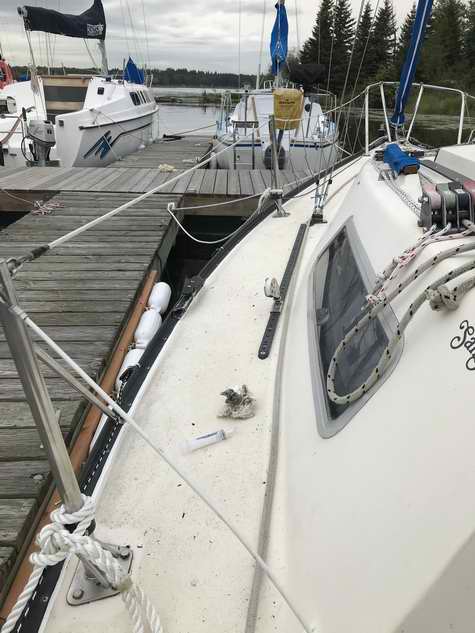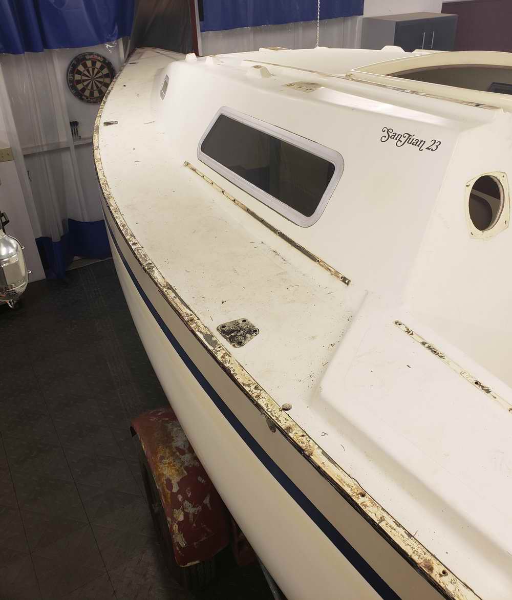 Below is Buddy Wright's boat during a 2021 overhaul. He decided to reseal both toe rails by removing them and sealing with butyl tape. Its a job for two people; one inside and one outside. He never did apply the bead of sealant along the deck as the butyl tape did the job. What oozed out was trimmed off as the screws were tightened. The hardest part was accessing the nuts at the aft end of the starboard toe rail. In the end he cut a 6" access hole through the aft end of the berth to reach those nuts.