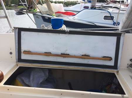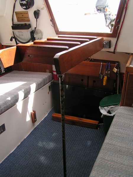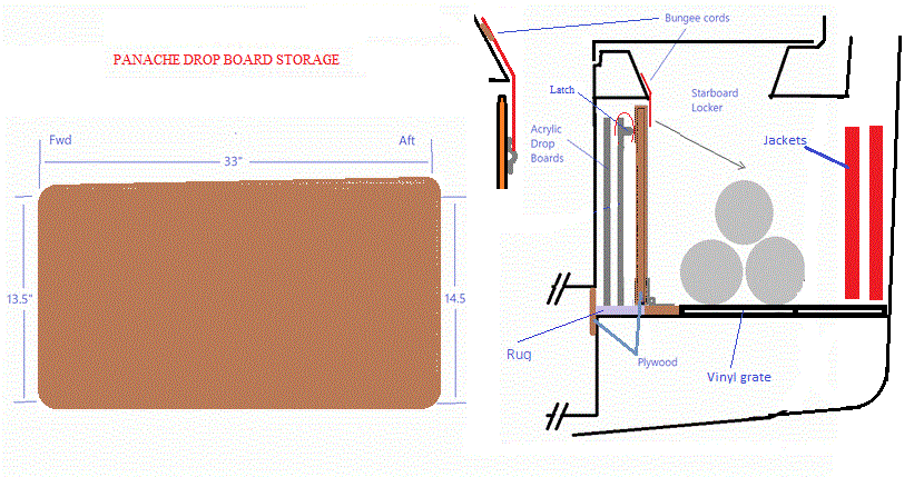 STORE DROP BOARDS WHILE UNDERWAY - Mike Foreman asked, "where does everyone store their boards while underway? I've tried under a cushion in the cabin but when the boat heels both the boards and the cushions take a hike. The only place left I can see is the port cockpit locker, which is a catch-all for everything else." Storing a single drop board while under way is a difficult task, as reported by many. Thankfully Panache's boards are split in two so I don't have this problem. While storing a two part board is less of a problem, they are still awkward to handle. I hate carrying them down the companionway ladder because the passageway is narrow and I'm usually in a hurry for some reason or another. I have a little rule on board Panache that works well. It goes like his, "If it's used inside then it must be stored inside. If it's used outside then it must be stored outside." The only exception to my rule is the hanked sails stored on the forward berth so they are accessible through the forward hatch. This has worked pretty well for me in most case as it's stored close to where it is used. It's a good idea to store things in a convenient place on board a small boat for the times that Mother Nature decides to get a tad nasty. Anyway the following are good ideas submitted by various people. Pick the one that suits you best.