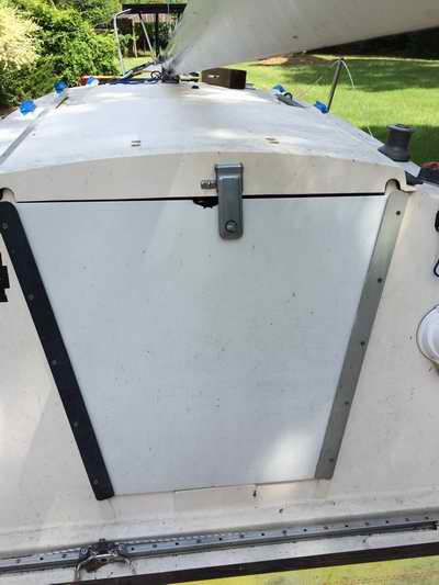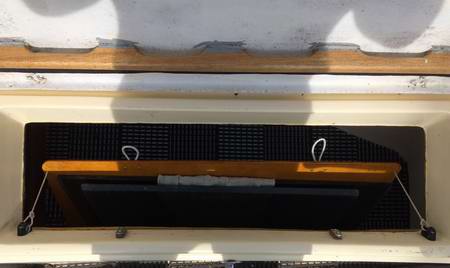 ![]() As usual, roughen up the old paint till dull, wipe with acetone, then spray paint with light even coats to prevent paint wrinkling. You can achieve a very smooth finish if you sand lightly between coats to remove bumps. Hang in the sun or a warm furnace room to bake for a few days before installing on the boat. Seal around the screw holes to keep water out. The drop board and sliding hatch rails are now a gloss white that is several shades lighter than the gel coat, looking like this brochure photo. This is a tough automotive enamel paint (expanding and contracting with temperature) so it will be easy to wash the grime that dirty hands leave. I'm happy to report they stay cool in the hot sun.