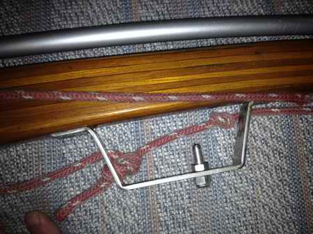 - Strengthened Tiller Tamer (2024-11-12) - When I reinstalled the Tiller Tamer I discovered the plastic back was cracked across the middle. This was due to the line strained over the pulley during all the years of use. UV in the cockpit doesn't help either! In this condition it would never stand up to another season. The fix was to strengthen the pulley bolt, replacing it with a 2" long SS wood screw set deep into the tiller. To retain the tiller strength I predrilled the hole. The strain of the line is now on the pulley and the wood screw instead of the back of the Tiller Tamer. It is stronger than ever and will last another 20 years, hopefully.