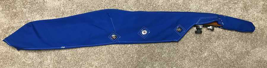 - A New Tiller Sleeve (2024-11-16) - Years ago when I added the attachments to my tiller I knew the existing Sunbrella sleeve couldn't fit and the Cetol finish would eventually suffer for lack of it. Back then I didn't own a heavy duty sewing machine to make a new sleeve and just kept adding coats of Cetol. The finish eventually started looking opaque which I didn't like. Having acquired a sewing machine I was not about to repeat that with a restored tiller. This is why I made a new sleeve that fits over the attachments to keep the water off. In addition, I added 1.5" wide full length webbing along the top, to protect the Sunbrella while resting on the bumpy tiller extension.
