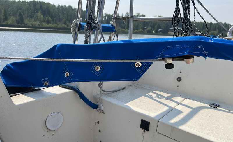 In the Spring of 2025 I finally deployed the new cover and so far the webbing over the tiller is working just fine, providing the chafe protection I envisioned. The cover stays put even better now that I added a fourth snap fastener at the back.