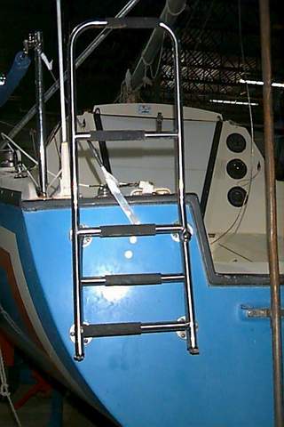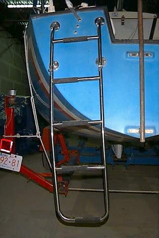 The Bolton ladder shown above was manufactured many years ago by Bolton Stainless Inc. This company manufactures custom stainless steel hardware for the boating industry. To view the current version of this ladder go to their web site. I have installed two Bolton ladders. It is absolutely top quality hardware. 8176,