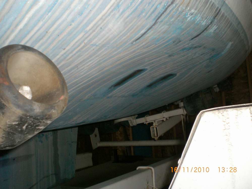 I bought an SJ23 that hadn't been licensed in 18 years and apparently spent all of them resting on a trailer equipped with rollers. The hull was also partially filled with water. Predictably this caused large indentations in the hull. I hope nobody else is confronted with this abuse but if you are, there is a method to remove the "dimples." Notice the dark roller marks on the hull and the general depressed area around them. The dimples did not pop out on their own after this roller was pulled back. Dimples this deep will slow the boat. SOLUTION