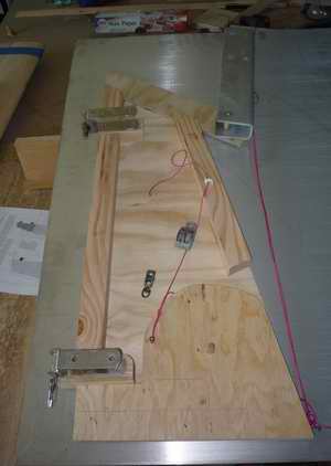 This picture shows the foil shape on the bottom of the blade. The top of the blade was left square to fit inside the rudder head assembly. I had to mark the rip fence and start and stop the cuts by lifting the board off the table saw blade on one side and starting the cut in from the end on the other side - the same technique used for a blind rabbet. I cut one side, turned the board over, and cut the other side for the same blade setting. Then I adjusted the rip fence and blade for the next pass. Yes, I DID make a practice foil before starting on the full size blade! Notice that the edges were left at full thickness to keep the plank level on the table saw. Once the foil was roughed out on the table saw I trimmed the edges and used a belt sander to finish shaping the foil smooth and formed the transition from the foil to the top of the blade that fits inside the head assembly. With the blade mostly formed, I started on the head assembly. Since the sides of the head are ¼" thick aluminum they are difficult to cut. I wanted them to fit and be symmetrical. For that reason I started with a plywood mockup shown below.