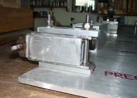 If you look carefully, you’ll notice the hole for the hinge pin is a lot bigger than the ½" suggested pin size. Not being satisfied with the having the ½" stainless bolt used for a hinge pin rubbing on the inner surface of the PVC nipple, I used two bronze bushings to make the slip surface. The inner bushing has an ID of ½" to fit the pin. The outer bushing has an OD that just fits the PVC nipple. The inner bushing fits properly in the outer bushing to make a nice fitting bearing surface. To prevent the outer bushing from slipping inside the PVC nipple, which would have been no better than the pin slipping, I scored the outside of the outer bushing and epoxied it into the hole in the nipple. Using bronze bushings is probably way overkill, but it does make for smooth movement of the blade.