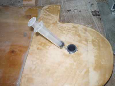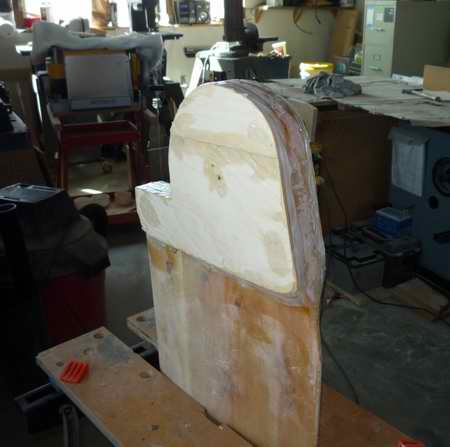 Once I was satisfied with the rudder head, I shaped the top of the blade. This is where using 2" spacers between the side plates became an issue. Since a (2xX)'' piece of lumber is really only 1.5" thick, I had to add some plywood shims to the top of the blade. I glued them on with epoxy, then filled the gaps and edges with epoxy paste thickened with a filler. Because I was going to cover the entire blade in epoxy glass, I made the shimmed up head a bit thinner than the 2" gap between the aluminum plates. I used West System epoxies and fillers, throughout the project.
