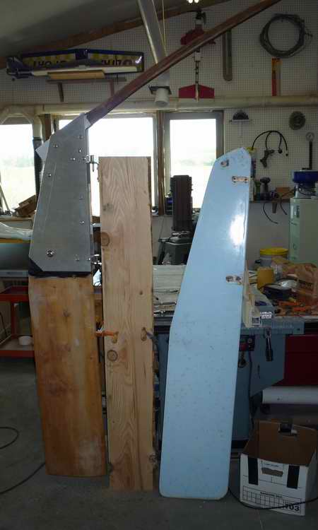The entire blade was then coated with fibreglass saturated in epoxy with most of the wear areas doubled up for extra wear resistance (primarily the leading edge on the bottom of the blade — right where rocks will, someday, find the rudder!). I also had to add a couple of extra layers of glass cloth to the top of the blade to get a proper fit in the 2" space in the aluminum head. It was trial and error to get the thickness of the blade right and involved extra layers of glass and lots of sanding.