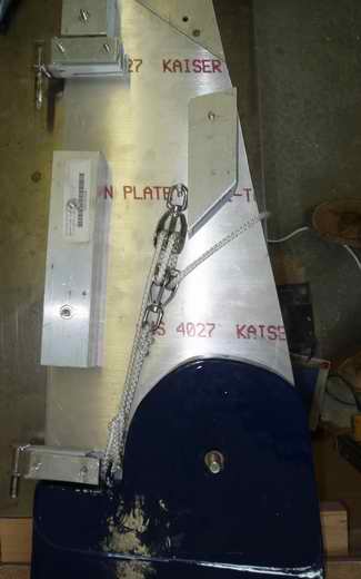 I also included the rudder pull down system from Tech Tip B10 and my own system for raising the rudder without using the lake bottom to start moving it up! More on that later. Once I was satisfied with the basic layout and shape of the rudder head, in plywood, I started working on the aluminum parts. I quickly learned that I have a wood working shop, NOT a metal working shop. Since, I really don’t have good equipment for cutting and shaping aluminum plate and tube, I made due with a combination of a right angle grinder, a reciprocating saw, and a belt sander to smooth the cut edges.
