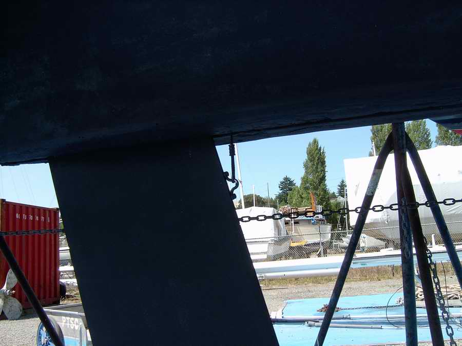 the lift system should have lasted longer. What a pain to repair. So he hauled the boat out of the water at Port Townsend and discovered that the eye strap screwed to the board had split in two which explains why the cable let go. When he replaced the eye strap he also discovered the two screws were slightly loose, but fortunately they hadn't come undone. A new eye strap was installed using two new screws (Allen drive), secured with Loctite to prevent them from from turning. Oh yes, a fresh coat of bottom paint looks nice too.