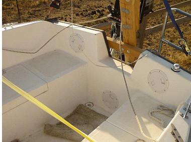 NOTE - It's a good idea to check the tightness of the outboard bracket, gudgeons, stanchion and boarding ladder nuts every few years. Resist the temptation to store loose stuff loose under the cockpit as it has a nasty way of sliding into things with each tack, possibly loosening the cockpit drain lines. You'll never find your stuff anyway! |