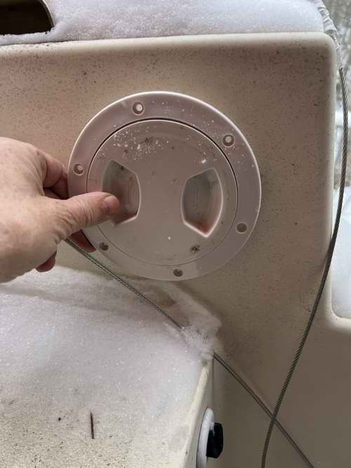 ![]() To retain the strength I'll back up the hole with a 1.5" wide 3/4" thick marine plywood ring installed on the inside. This is likely unnecessary but I have a habit of building everything to withstand WWIII! A ring of 3/4" thick wood has the strength to retain the stiffness. I'll use wood screws so I don't snag things on the way in/out of that hole. The wood ring is coated with epoxy to protect against rot. If I were to paint it I'd use urethane paint. Alternatively, a ring could be made of aluminum but holy cow that would be over kill to the Nth degree. Fortunately this ring has a seal outside the thread to keep water out. The temporary location shown at right is roughly lined up with the outboard bracket and where I'll cut the hole. The gel coat will be taped over to outline the hole and to prevent pulling up chips with the jig saw. To install the ring:
