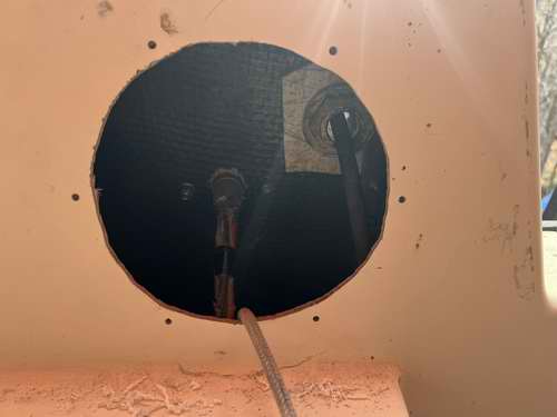 The location shown at right is lined up with the outboard bracket and close to where I cut the hole. This vinyl hatch has a seal outside the thread to keep water out, especially if the thread is lightly coated with silicon grease.