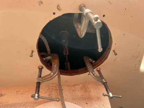 Drill mounting holes for the rings around the fibreglass hole. (Use vinyl ring as template).