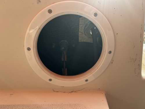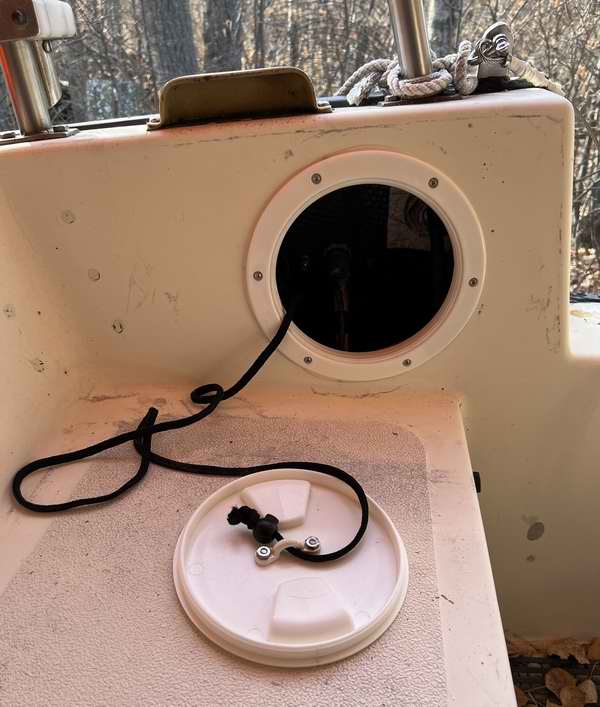 UPDATE Panache Inspection Hatch (2025) - Late this Fall I too installed a 6" ID vinyl inspection hatch on Panache to check all the hardware inside the transom: nuts for outboard bracket & backstay chain plate, cockpit speaker, outboard wires and the gas hose. It's just too much effort to reach this stuff doing the "cockpit crawl" over the cockpit drain hoses. I was given a 5" ID hatch but it's not quite large enough to slip my arm through. This job requires a 6" ID hatch to reach things. The rest of the hardware (rudder gudgeons & port chain plate) are fairly easy to reach from the cockpit locker. That locker needs to be cleaned out every once in a while anyway!