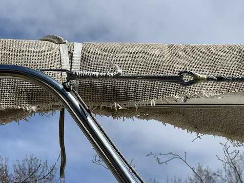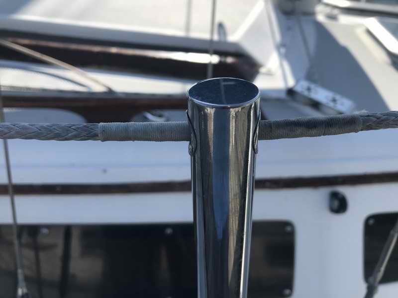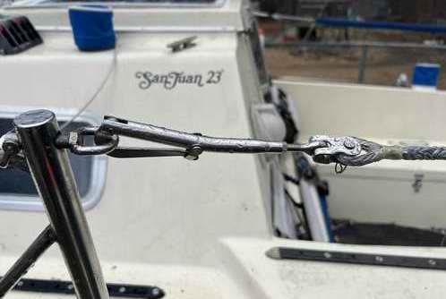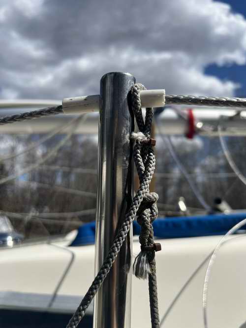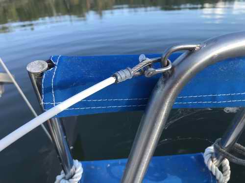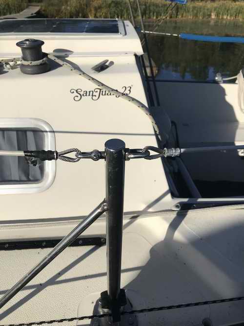 Lashing - I used 1/8" Dyneema lashing to tension the lifelines, discarding the turnbuckles. It is difficult to splice Dyneema to the exact length to fit with a turnbuckle. Lashing line tied at the pulpit is easy to remove for winter storage.