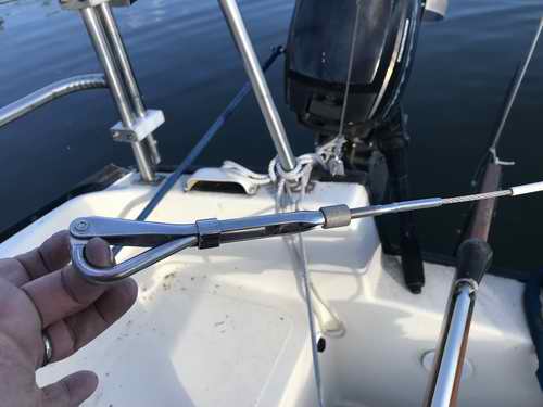 The pelican hook is now at the forward end of the gate clipped to the stanchion eye at the stanchion at the front of the cockpit. The Dyneema spliced eye is pinned to the turnbuckle toggle screwed (LH) into the pelican hook.