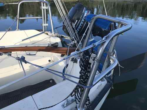 Transom Gate - I seldom close this gate since it blocks access to the outboard for starting or stopping it. Besides, I see no need to fall backwards! I do close it during rough weather though. I've used the ladder a few times and stepping through the open gate does make it easier to board.
