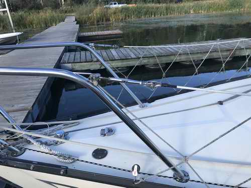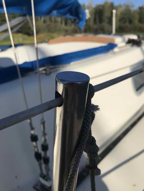 Forward Stanchion - The lifeline is pulled through a vinyl tube (ends bevelled inside) inserted through the mid stanchion. It also supports the lifeline net as before.