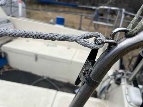 When the gate is open the pelican hook is now clipped on the port pushpit to protect the cockpit gel coat from chafe.