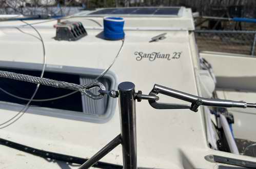 Stanchions - San Juan stanchions are hollow tubes with an open bottom through the foot. This means any water that enters can drain out and not split a tube when frozen. There is a tiny tube welded inside the top hole to pass the lifeline through. The finished edge of the lifeline hole is sharp enough to eventually cut through the Dyneema. This is why I inserted a split vinyl sleeve to protect the SS lifelines.