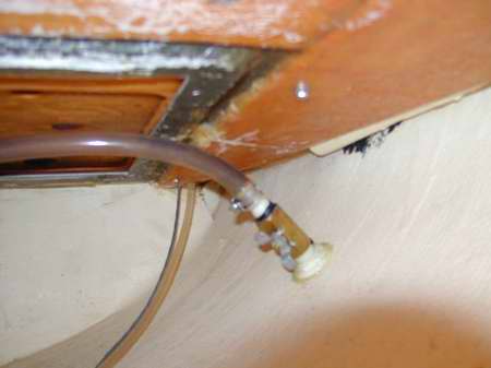 GALLEY with SINK (2003) - The "wood box" that houses the sink also stores the pots, pans, kettle, coffee pot, dish soap & scouring utensils. The faucet is equipped with a latching switch to operate the water pump installed adjacent to the water tank under the forward berth. See Tech Tip C18. For servicing and cable constrictions, the faucet is one of the few devices that is connected with grease filled Marrettes (wire nuts) instead of permanent connectors. The sink drains into a portable grey water tank. To speed up the flow the drain fitting is equipped with a clear vinyl vent hose leading to the top of the cabin. I drilled and tapped a hole through the side of the downspout ABS to screw in a threaded fitting. You can see the vinyl tube against the bulkhead in the photos above. Nice and high to keep lake water out.
