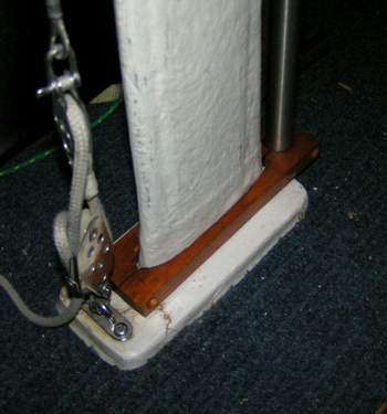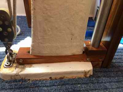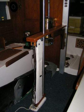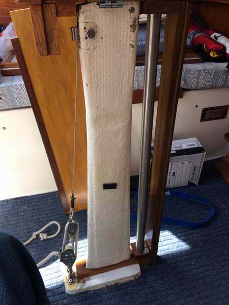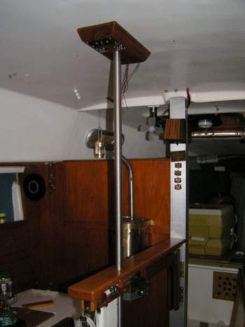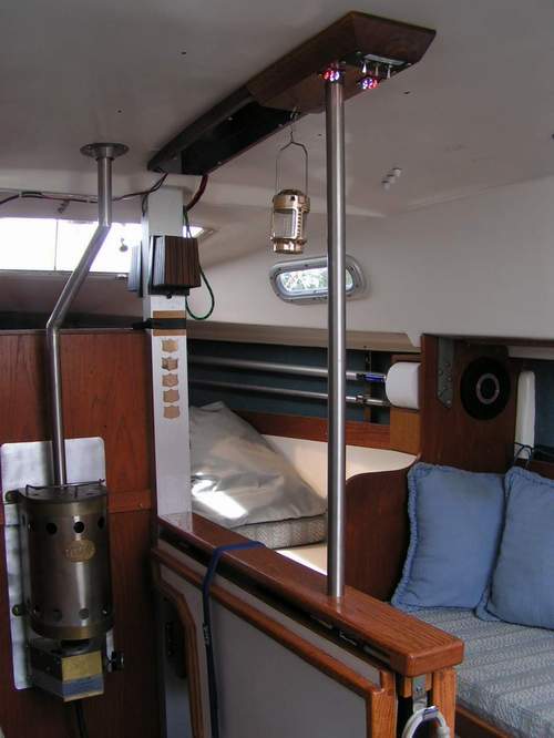 ENCLOSED TABLE PEDESTAL (2015) - I've always been concerned about the strength of the fibreglass table pedestal when sailing in rough weather with someone walking (more like stumbling) through the cabin. It is so natural for a person to lean against the table bridge for support when the boat dives into a deep trough, there being no other hand holds inside the cabin. My fear is that body weight might crack or snap the pedestal if the motion is violent enough. NOT a good situation as the cabin sole is ~1 foot below the water line. Don't believe me? Remove the table and look down the pedestal. The Clarks would never have sold an SJ23 if the pedestal was transparent. It's probably a good idea to have something handy to plug the hole as the boat will sink in less than 5 minutes. Oh darn it all! If water occasionally slops out the top, its a good sign to reduce the heel or slow down! I'm not alone in this judgment as other people have emailed me with similar concerns. By the way, I have no intention of testing the strength of the pedestal to put my concerns to rest as I have a pretty good understanding of physics and my imagination has served me well over the years! "The hull liner is a one-piece component that is bonded into the hull using a bedding of chopped strand mat and a polyester resin thickened with Q-cell, microspheres made of fibreglass. Visualize a thick frosted cake. With the resin catalyzed and the "cake frosted", the interior pan is lowered over the table post, aligned with a fore/aft, port/starboard jig. A hose is then attached to a hole next to the table post and a vacuum applied. The hull liner is instantly pulled tight down to the hull and the vacuum maintained until the resin sets. You'll see remnants of the microsphere putty inside the settees and all points of hull/interior contact. Think frosting again. You will note a void beneath the head floor. Don't fill that with foam. It's fine. If you spill water in the v-berth by cleaning, you can dry it by sponge or towel. If you continue to see water down there, there is a leak somewhere, and the usual suspects need to be checked." So my solution is a 1" OD stainless steel support post, floor to ceiling, installed just forward of the table pedestal. Think of it as a grab post similar to one on a city bus. The ceiling height of an SJ23 is just low enough to make it hard on my back while cooking, working in the cabin or getting off a settee. With this post it is easy to manoeuvre around the cabin by swinging from it. This project is not too difficult as it requires mostly carpentry skills. With planning you can incorporate other creature comforts that are so appreciated on a small cruiser. Shown above is the finished post with electrical switches and LED lights added to the ceiling support. The red LEDs provide adequate night vision and the white LEDs are wonderful for general illumination. They are too far away for reading a book but provide enough light for all movement in the cabin.