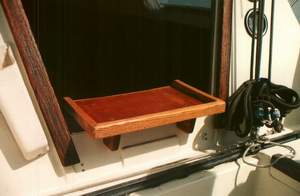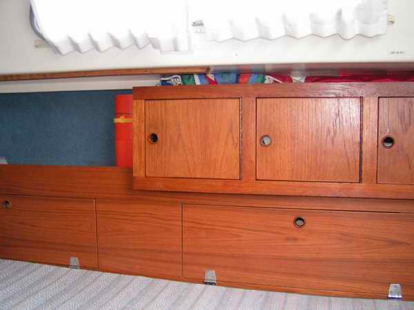 SETTEE DRAWER - Several members have installed a drawer under their settees to create convenient storage. It sure beats lifting a cushion and digging through the top access holes or asking someone to move off the bunk. While I have found a drawer to be very convenient on larger boats, on an SJ23 I would recommend installing a flip down hinged door. There just isn't enough room to pull out a "square" drawer. Whether you install a drawer or a door, you must restore the wall strength to retain the rigidity of the hull. However, if you sail in an area with high winds and rough water, I would think twice about this installation. I am not going to install drawers on Panache! Some issues to note are: