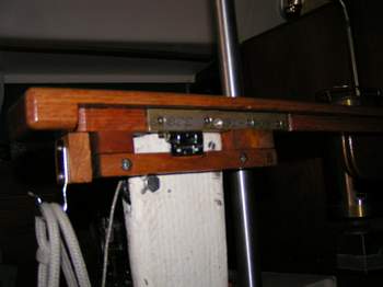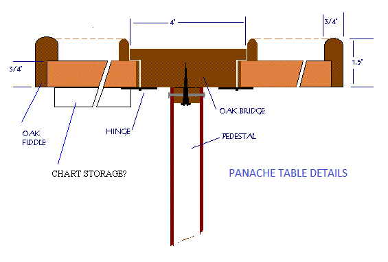 This is the sketch I used to rebuild my drop-leaf table with a wider bridge. The measurements will be close to your boat, but please verify them for your installation. The oak fiddles were glued and screwed with the screw heads plugged along the perimeter of each leaf. At one time I intended to add fiddles to the bridge but their absence has not been a problem. Note the small wood plug screwed to the bottom of the bridge and resting inside the top of the pedestal. It helps to anchor the table to the top of the pedestal. In future I may mount a 1" deep shelf under the port leaf to store folded charts. This place is well protected from the weather and is relatively convenient to access. TOP |