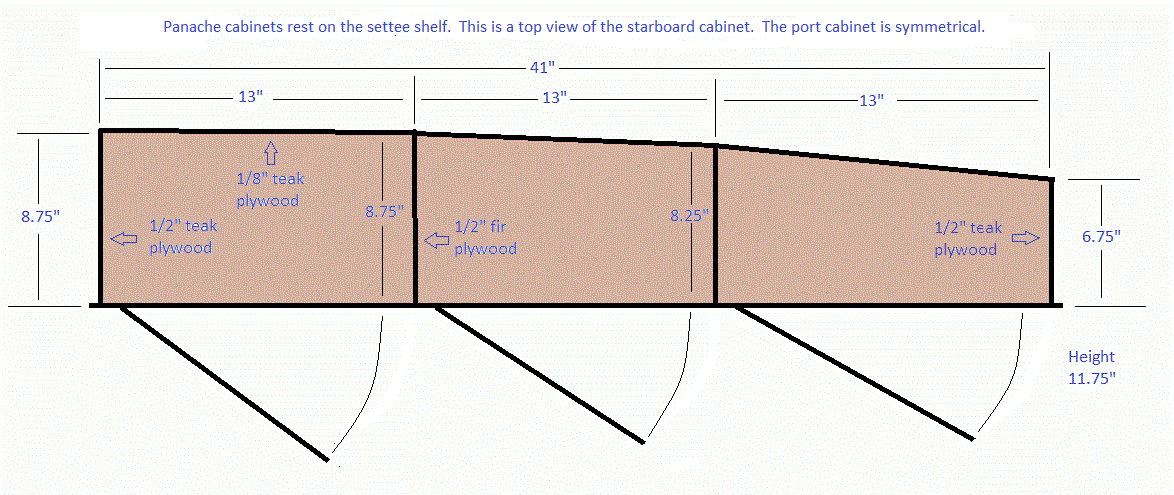 GALLEY UPPER CABINETS - Panache's cabinets rest on the settee shelf and overhang a bit through a recess cut in the top of the back rest. The 1/2" cabinet box is divided into 3 equal compartments and the back is closed with 1/8" teak plywood curved to follow the contour of the hull (see diagram below). All joints are pin nailed with aluminum nails and securely glued with water proof Gorilla Glue. The doors are supported inside a teak frame moulding (1/2 x 1)" glued to the front. The edges of the doors are capped with 1/8" thick teak and the finger pull holes are lined with purpose made teak inserts. Nice and smooth on the fingers. Each door swings on a brass piano hinge and is latched with a zinc coated roller catch, technology right out of the 1950s. They look ugly but never rattle and don't release when the contents push against the inside of the door with the hull heeled well over. I see no reason to replace them since some designs reach perfection and for that reason they should be left alone. I decided against "bullet proof" elbow catch latches when I saw a door blast open on my buddy's boat, heeled at 400. The contents ended up all over the cabin sole. What a mess and so much for the "bullet proof" latch. The cutlery is stored in purpose made wood pockets glued to the inside of a door and the plates, bowls and cups are separated by dividers inside the cabinet. If I do any extended cruising, food stores, beer, wine and scotch (not in that order) go under the settee in vinyl basins where it is cool. The cabinets are securely mounted to the settee with three well spaced SS machine screws backed up with large washers. The dimensions are shown below if you want to build your own cabinets.