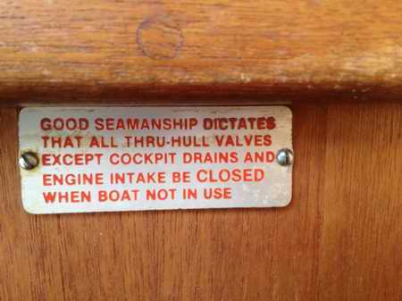 NOTE 1 - Some SJ23s were equipped with a gate valve for the galley drain. It should be exchanged for a ball valve since a gate valve seal can fail at the least opportune time. Operate a ball valve at least once a month so it is lubricated with water and free to operate when it must be closed. A valve that can't be closed will put you in deep el toro poo poo. While you are down there, check the integrity of the thru-hull with a severe wiggle after the valve is closed. If you close the valve every time you leave the boat you can dispense with this monthly routine. This warning label on my buddy's C&C27 is self explanatory. -->